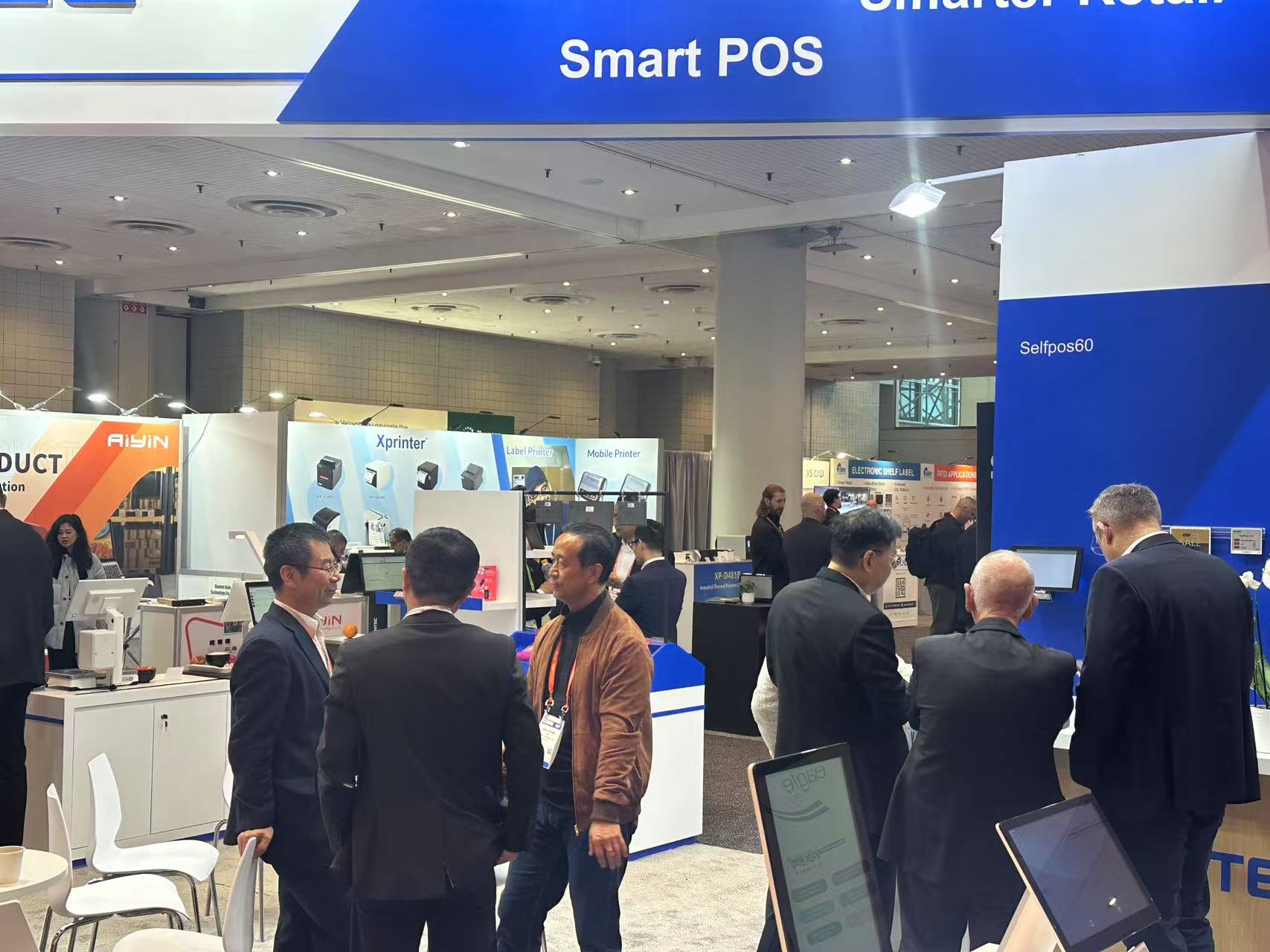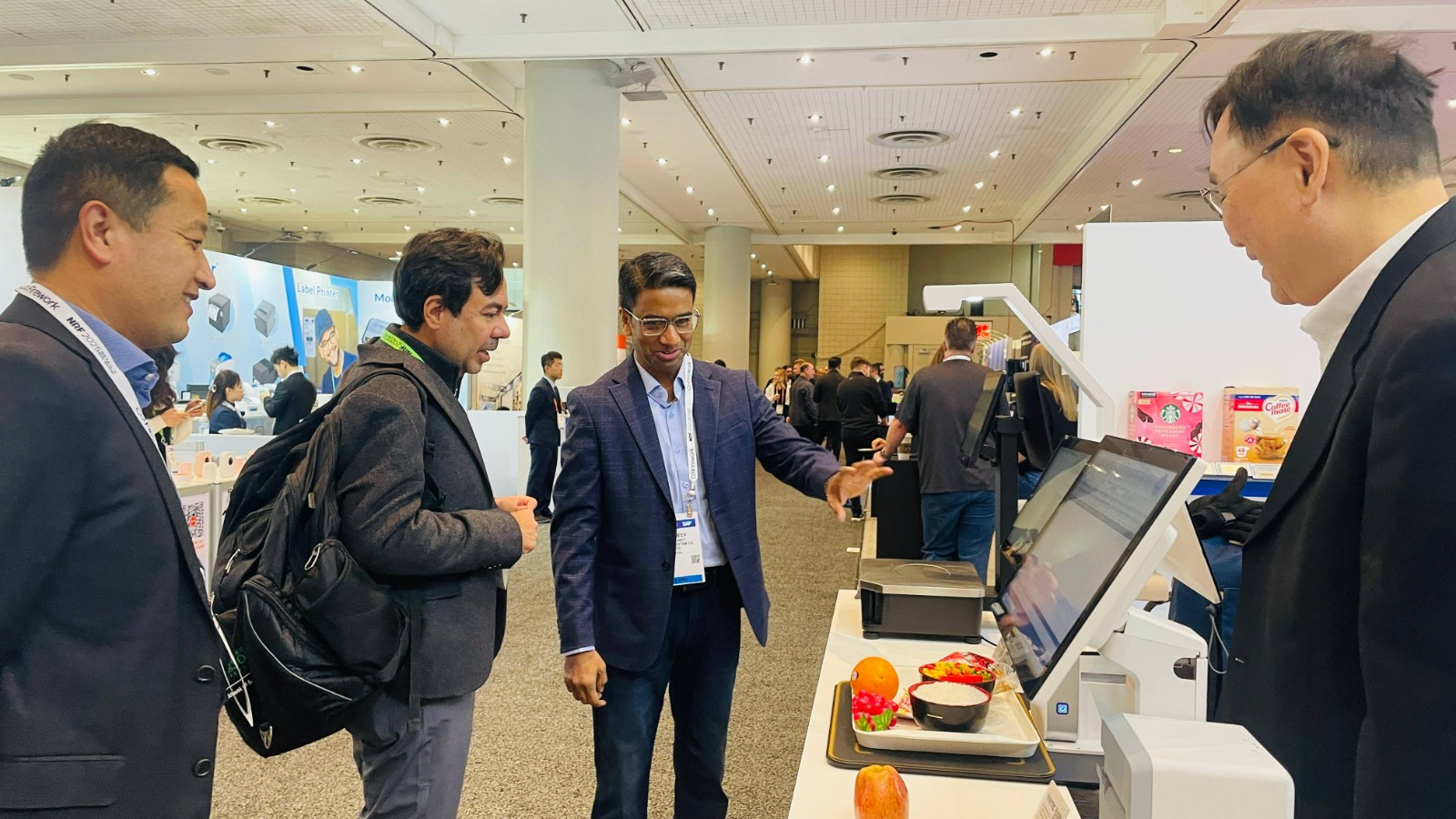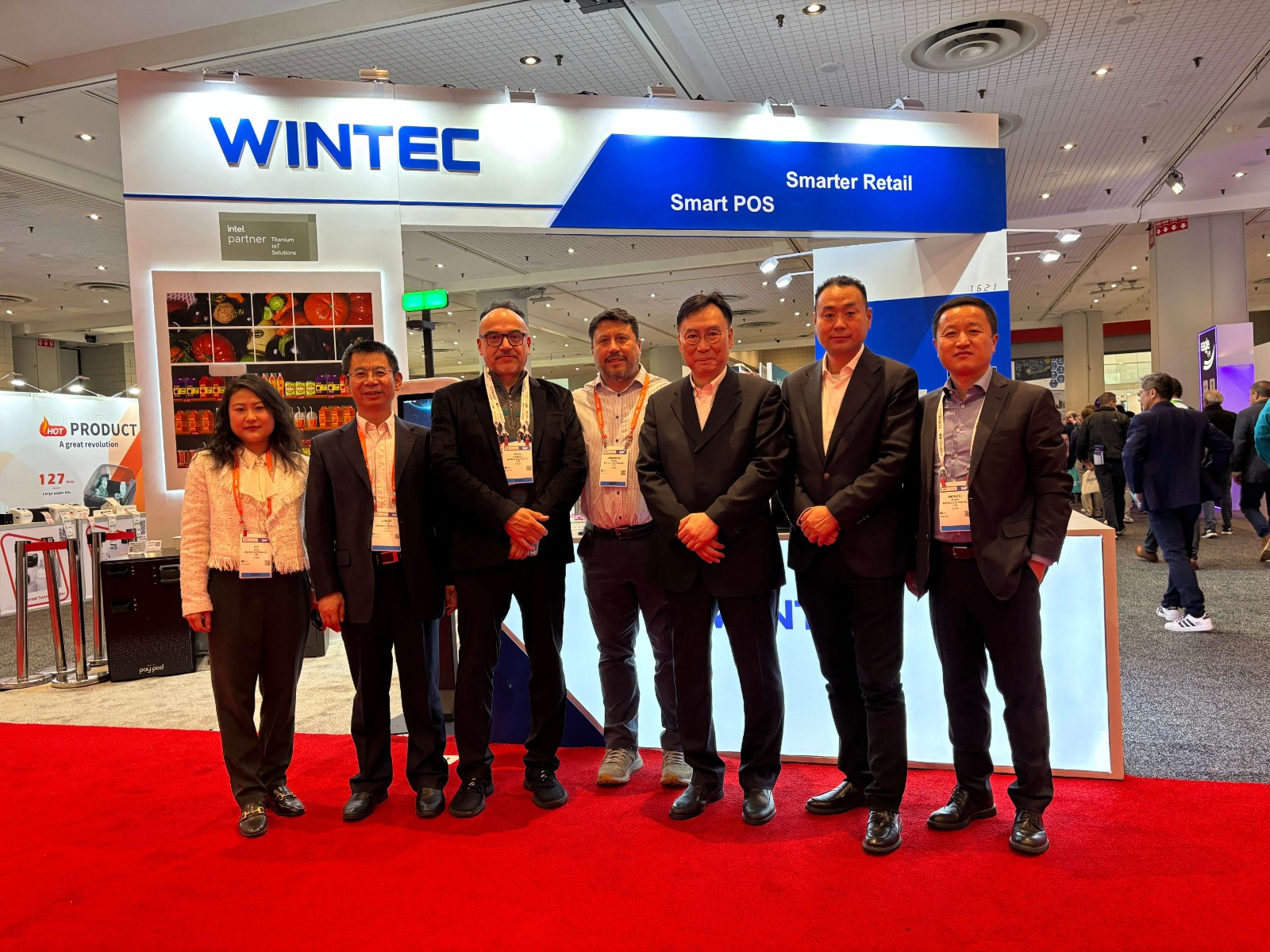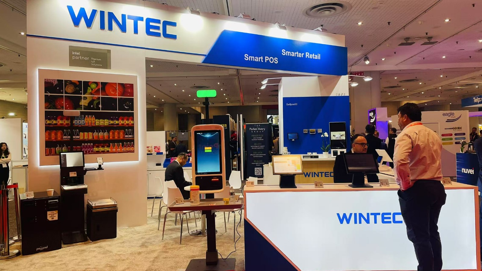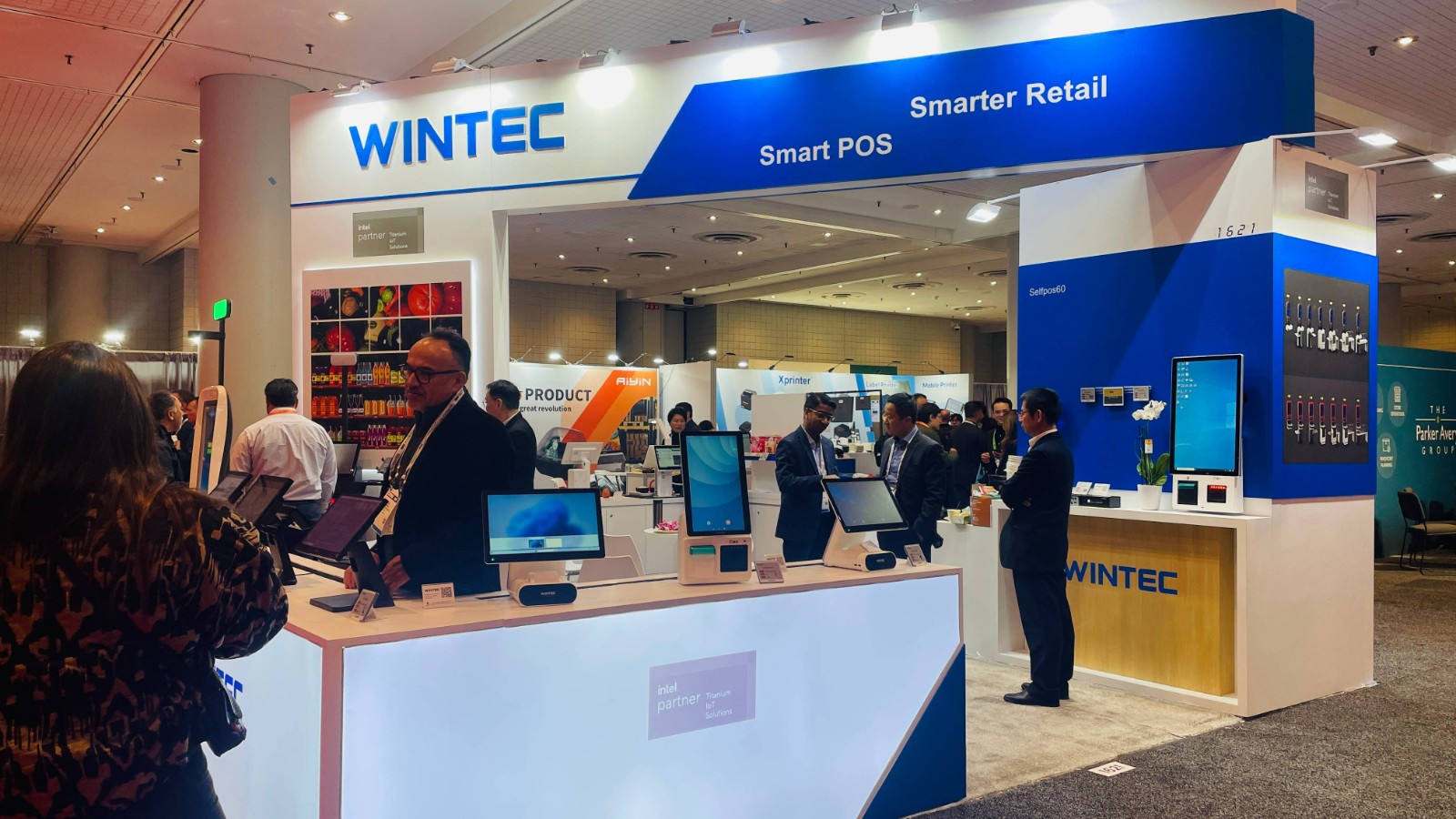 本次展会WINTEC首次扩大展位面积,以更开放的搭建风格与观众见面。展示方案有壁挂展品演示查价机和自助点餐机,一体触控POS机和桌面式迷你自助结算终端,落地式的超市自助收银机,AI产品方案演示区和电子价签产品。