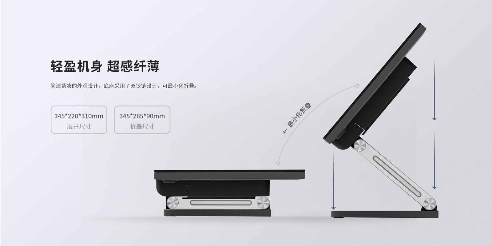 整机尺寸380*230*350(15"主屏尺寸) 510*210*380(21.5"主屏尺寸)
