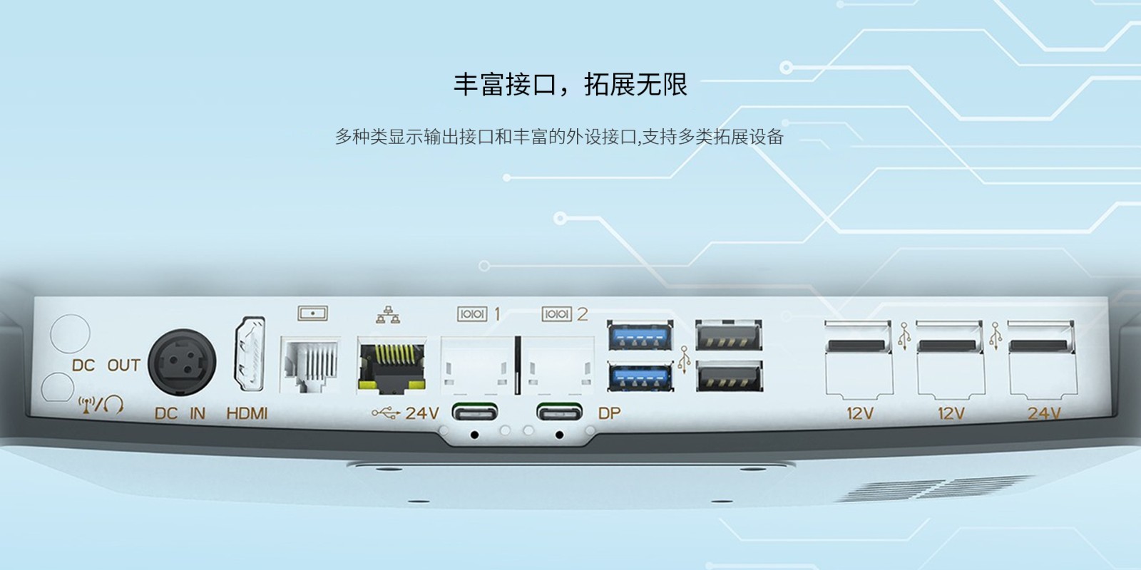 外部接口4*USB, 2*RS232(2*RJ48), 1*RJ45,1*DK,1*24V DC_IN,1*HDMI,1*DC_OUT(12V),1*AUDIO (选配) +(3*USB or 3*POWERUSB(1*24V+2*12V)or 2*RS232 ,选配)